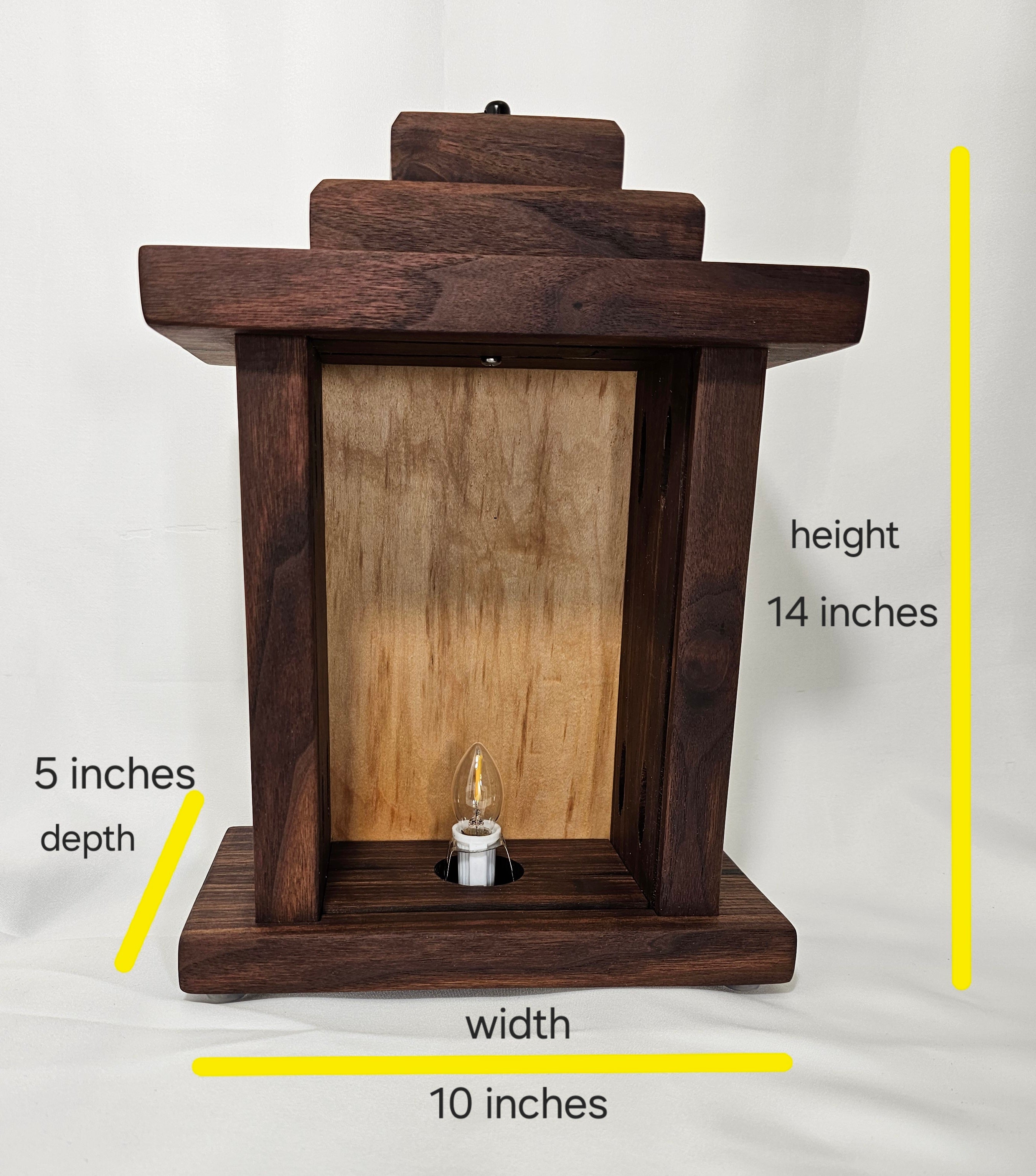 Lantern base stands at 14 inches (35.5 cm) tall; 10 inches (25 cm) wide; 5 inches (12 cm) deep. Embrace the individuality of each Lantern with its natural wood features.